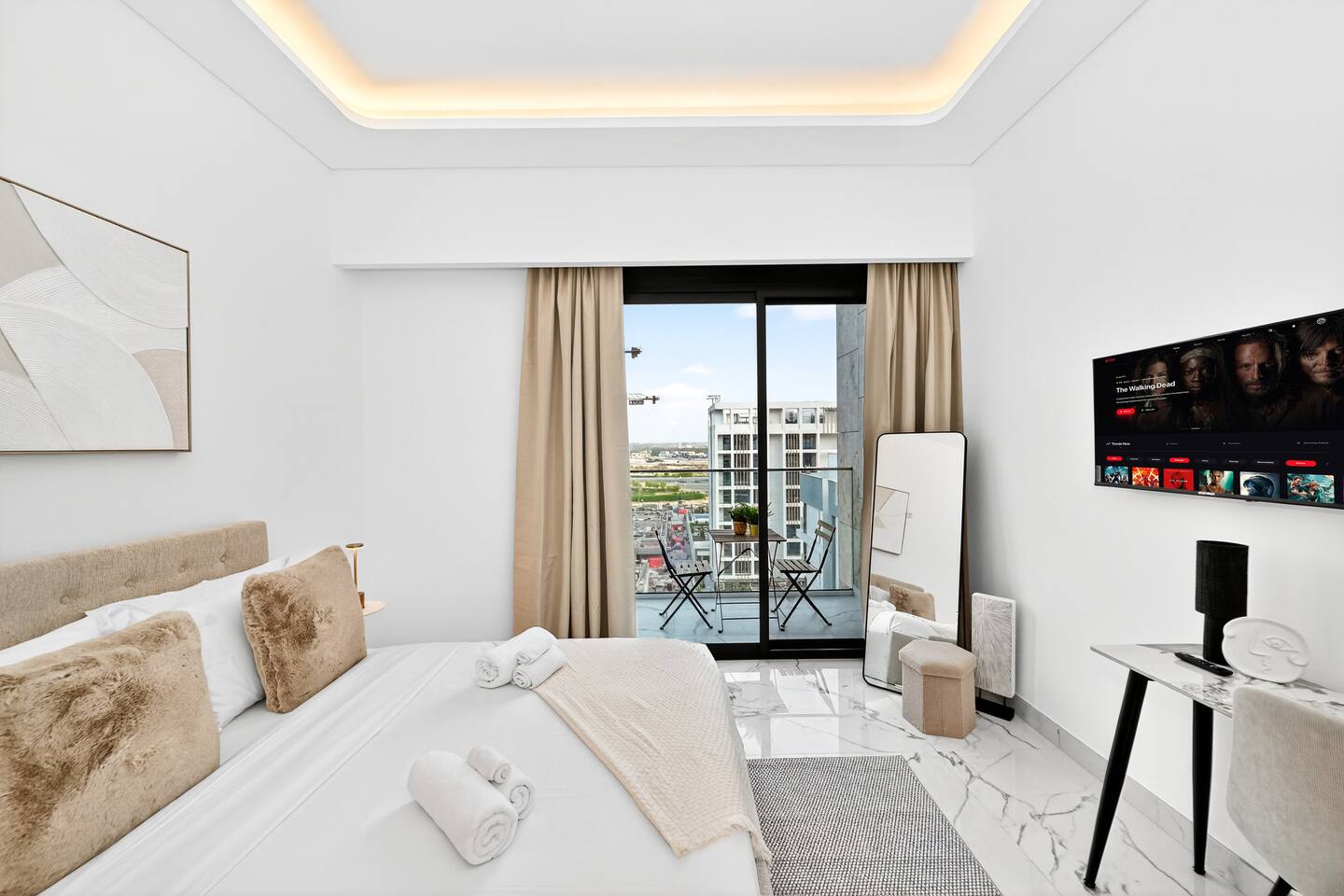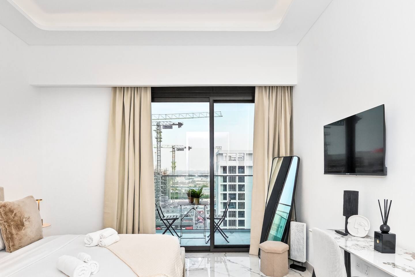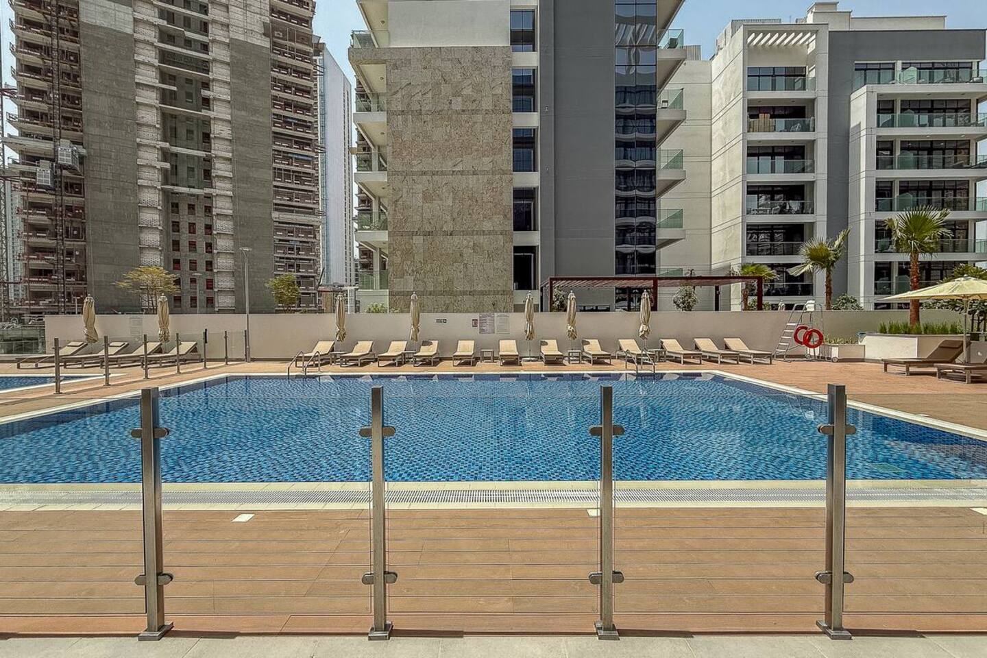 Riviera Getaway — Superior Studio on the Highest Floor in Azizi ★★★★★ Welcome to your brand-new urban hideaway: a refined 48 m² (≈516 sq ft) studio finished in marble and completed in August 2025, perched on the highest floor of Azizi Riviera. In the heart of Mohammed Bin Rashid City, the building is part of the prestigious Azizi Riviera project, inspired by the French Riviera, featuring pedestrian waterfronts, landscaped green areas, and a lively urban atmosphere. Dubai is a city in constant evolution, developing at an exponential pace. The Azizi Riviera community is now in its final phase of construction and nearly completed: this means guests can enjoy a brand-new structure, modern and equipped with all main services already fully operational. Contemporary timeless elegance, and perfectly located: - 3 minutes from Meydan RaceCourse; - 7 minutes from The Track Meydan Golf Club; - 10 minutes from Dubai Mall; - 10 minutes from Burj Khalifa; - 10 minutes from Downtown; - 10 minutes from Dubai Creek Tower; - 10 minutes from Hartland International School; - 10 minutes from Latifa Hospital; - 15 minutes from Dubai International Airport (DXB); - 20 minutes from Dubai Marina; The space: Designed for comfort and elegant style, this exclusive studio is ideal for couples, solo travelers, and business guests who value quality and convenience. Inside, the apartment combines marble finishes with a timeless elegance and contemporary style. It is laid out as follows: - cozy sleeping area with extra queen-size bed, premium linens and wardrobe; - 43” TV with Firestick TV and Amazon Prime Video Included, Wi-Fi; - modern kitchen with oven, stove, microwave, fridge, kettle, washing machine and Nespresso coffee machine with capsules; - dining/work table with chairs, perfect for meals or remote working; - Smart home devices of the latest generation to control lights and air conditioning easily remotely via app; - private balcony with table and chairs, ideal for morning coffee or evening drinks; - elegant bathroom with marble finishes, walk-in shower, towels and complimentary toiletries; - iron, ironing board and drying rack available for guests’ convenience. Building & Amenities: - n.1 free reserved covered parking space; - Play area with Ping-Pong Table; - n.1 free on-site gym; - n.2 swimming pools; - 24/7 Security; - Reception. Why You’ll Love It: - Highest-floor serenity superior, elegant and modern feel throughout; - Smart layout that makes 48sm totally feel spacious and relaxing; - Full smart-home experience with lighting and air-conditioning automation for superior comfort; - Quick access to Dubai’s icons while staying in a calm, upscale community. Check-in and Check-out: - Check-in is self-service with an electronic lock. Access codes are sent within 24 hours prior to arrival, after uploading the documents required by law. - For check-out, no key return is required: simply close the door when leaving. Guests are kindly asked to check they haven’t left any belongings behind. Book your Riviera Getaway and enjoy a superior stay above the city—new, timeless elegant, and effortlessly connected to everything Dubai.