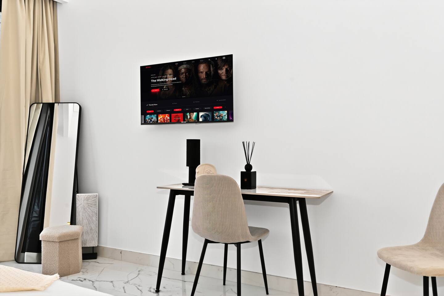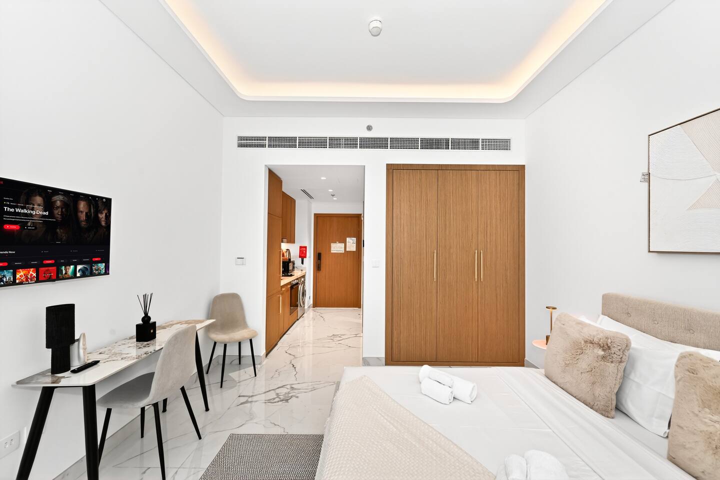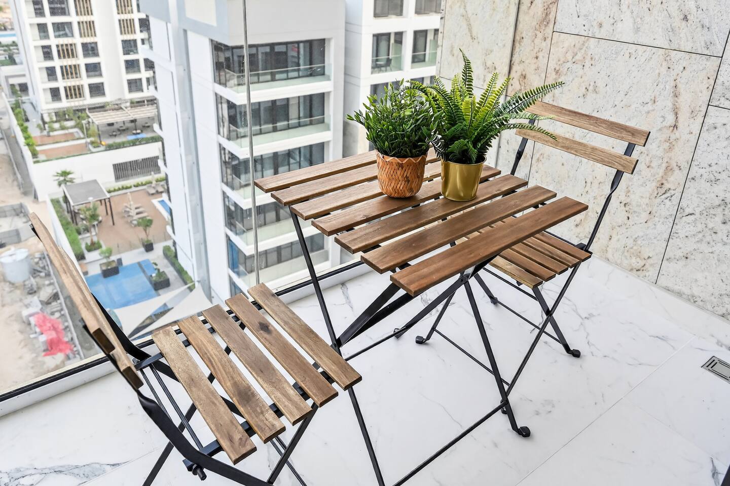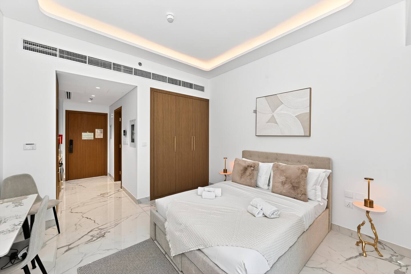 Riviera Getaway — Superior Studio on the Highest Floor in Azizi ★★★★★ Welcome to your brand-new urban hideaway: a refined 48 m² (≈516 sq ft) studio finished in marble and completed in August 2025, perched on the highest floor of Azizi Riviera. In the heart of Mohammed Bin Rashid City, the building is part of the prestigious Azizi Riviera project, inspired by the French Riviera, featuring pedestrian waterfronts, landscaped green areas, and a lively urban atmosphere. Dubai is a city in constant evolution, developing at an exponential pace. The Azizi Riviera community is now in its final phase of construction and nearly completed: this means guests can enjoy a brand-new structure, modern and equipped with all main services already fully operational. Contemporary timeless elegance, and perfectly located: - 3 minutes from Meydan RaceCourse; - 7 minutes from The Track Meydan Golf Club; - 10 minutes from Dubai Mall; - 10 minutes from Burj Khalifa; - 10 minutes from Downtown; - 10 minutes from Dubai Creek Tower; - 10 minutes from Hartland International School; - 10 minutes from Latifa Hospital; - 15 minutes from Dubai International Airport (DXB); - 20 minutes from Dubai Marina; The space: Designed for comfort and elegant style, this exclusive studio is ideal for couples, solo travelers, and business guests who value quality and convenience. Inside, the apartment combines marble finishes with a timeless elegance and contemporary style. It is laid out as follows: - cozy sleeping area with extra queen-size bed, premium linens and wardrobe; - 43” TV with Firestick TV and Amazon Prime Video Included, Wi-Fi; - modern kitchen with oven, stove, microwave, fridge, kettle, washing machine and Nespresso coffee machine with capsules; - dining/work table with chairs, perfect for meals or remote working; - Smart home devices of the latest generation to control lights and air conditioning easily remotely via app; - private balcony with table and chairs, ideal for morning coffee or evening drinks; - elegant bathroom with marble finishes, walk-in shower, towels and complimentary toiletries; - iron, ironing board and drying rack available for guests’ convenience. Building & Amenities: - n.1 free reserved covered parking space; - Play area with Ping-Pong Table; - n.1 free on-site gym; - n.2 swimming pools; - 24/7 Security; - Reception. Why You’ll Love It: - Highest-floor serenity superior, elegant and modern feel throughout; - Smart layout that makes 48sm totally feel spacious and relaxing; - Full smart-home experience with lighting and air-conditioning automation for superior comfort; - Quick access to Dubai’s icons while staying in a calm, upscale community. Check-in and Check-out: - Check-in is self-service with an electronic lock. Access codes are sent within 24 hours prior to arrival, after uploading the documents required by law. - For check-out, no key return is required: simply close the door when leaving. Guests are kindly asked to check they haven’t left any belongings behind. Book your Riviera Getaway and enjoy a superior stay above the city—new, timeless elegant, and effortlessly connected to everything Dubai.