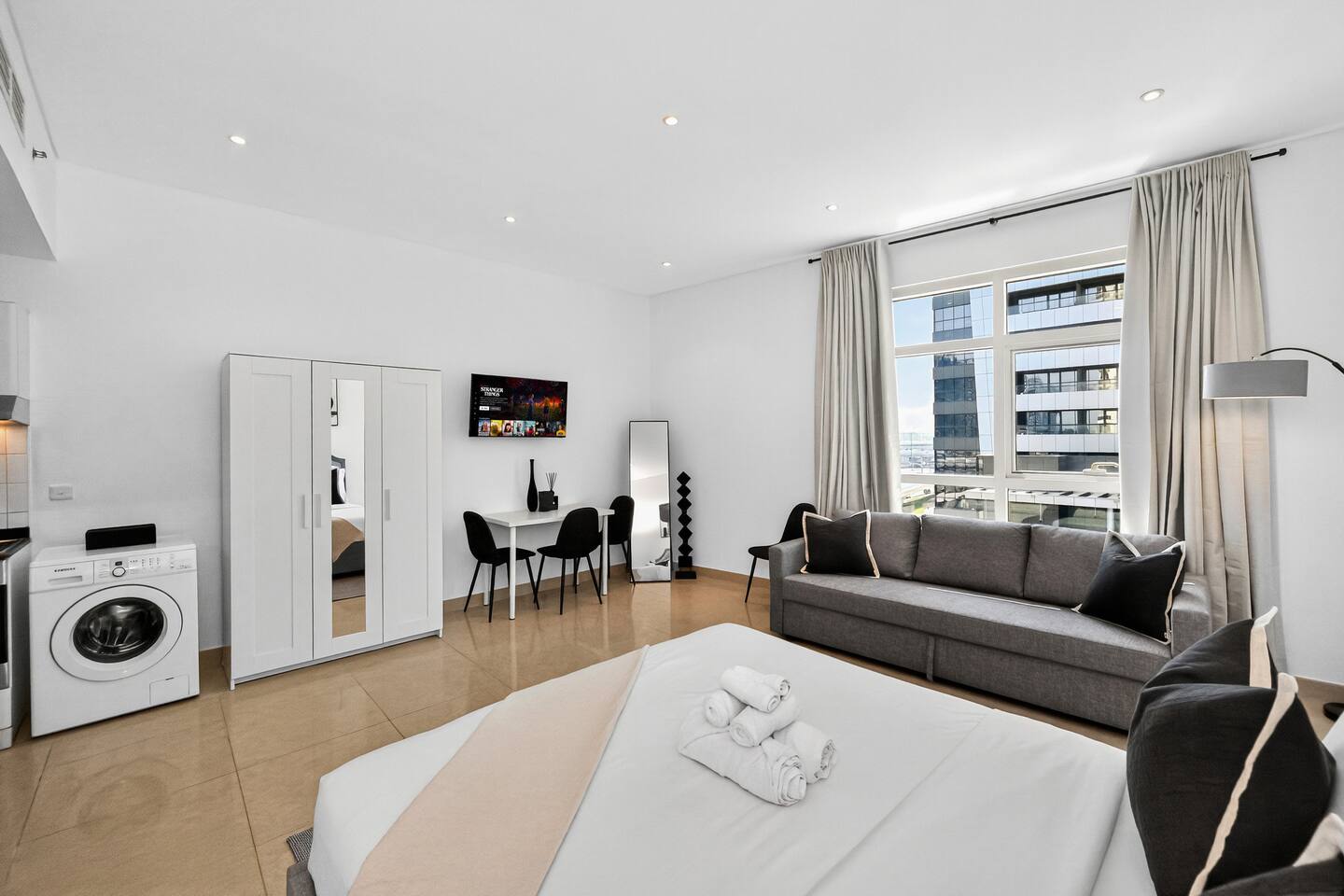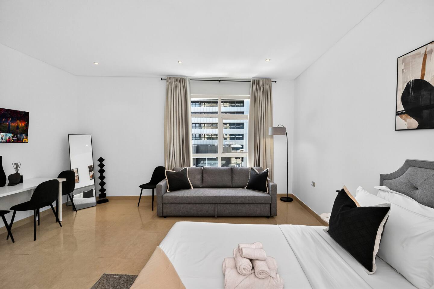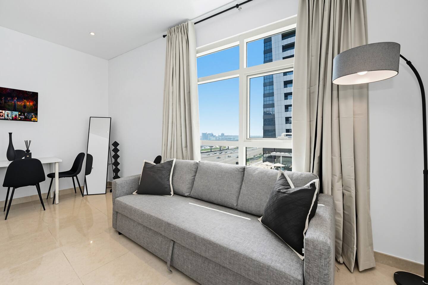 Yacht Bay Tower — Marina Apartment with Pool, Gym, Sauna and Jacuzzi perfectly located near the Metro Access, Tram, Jumiera Beach, Marina Walk and Marina Mall ★★★★★ Welcome to your stylish urban retreat: a refined 55 m² studio, offering modern comfort and timeless elegance in the heart of Dubai Marina. Nestled in one of Dubai’s most vibrant districts, the residence combines sleek design with exclusive amenities: two swimming pools with hydromassage, sauna, jacuzzi, a state-of-the-art gym, and a 24/7 reception with a uniquely designed lounge area. Perfectly located: - 5 minutes walk to the Jumiera Beach; - 5 minutes walk to the Dubai Marina Mall; - 5 minutes walk to the Dubai Marina Walk; - 1 minute walk to the Metro Station (direct line to the DXB Airport, Burj Khalifa, Dubai Mall, Downtown, and the whole of Dubai) and Tram. The Space: Designed with both elegance and functionality in mind, this exclusive studio is ideal for couples, solo travelers, families, or business guests who value comfort and convenience. Inside, you’ll find: - Cozy sleeping area with a queen-size bed, premium linens, elegant headboard, and wardrobe; - Comfortable sofa-bed for up to 2 additional guests; - 43” Smart TV with Prime Video and streaming apps, Wi-Fi included; - Modern kitchen fully equipped with oven, stove, microwave, fridge, kettle, washing machine, Italian Nespresso coffee machine with capsules, and kitchenware; - Dining/work area with 4 chairs, ideal for meals or remote working; - Large window with views of the Marina Community; - Elegant bathroom with bathtub-shower combo, towels and complimentary toiletries, plus a special Vitamin C shower filter to prevent hair dryness and improve water quality. Building & Amenities: - n.1 free reserved covered parking space; - n.2 outdoor swimming pools with hydromassage; - n.1 Jacuzzi; - n.1 Sauna; - Fully equipped gym with cardio and weight machines; - Elegant reception area, unique in its design; - 24/7 security and concierge service. Why You’ll Love It: - Prime Dubai Marina location with direct Metro and Tram access, Jumiera Beach, Marina Walk and Marina Mall; - Modern, bright, and functional layout that feels both stylish and relaxing; -Full access to premium building amenities for wellness and leisure; - Perfect mix of business convenience and holiday comfort. Check-in and Check-out: Check-in starts at 3:00 PM via self-service Key Box. Access codes are sent within 24 hours prior to arrival, once documents required by law are received. For check-out, simply put the key in the key box. Please double-check to ensure you haven’t left personal belongings behind.