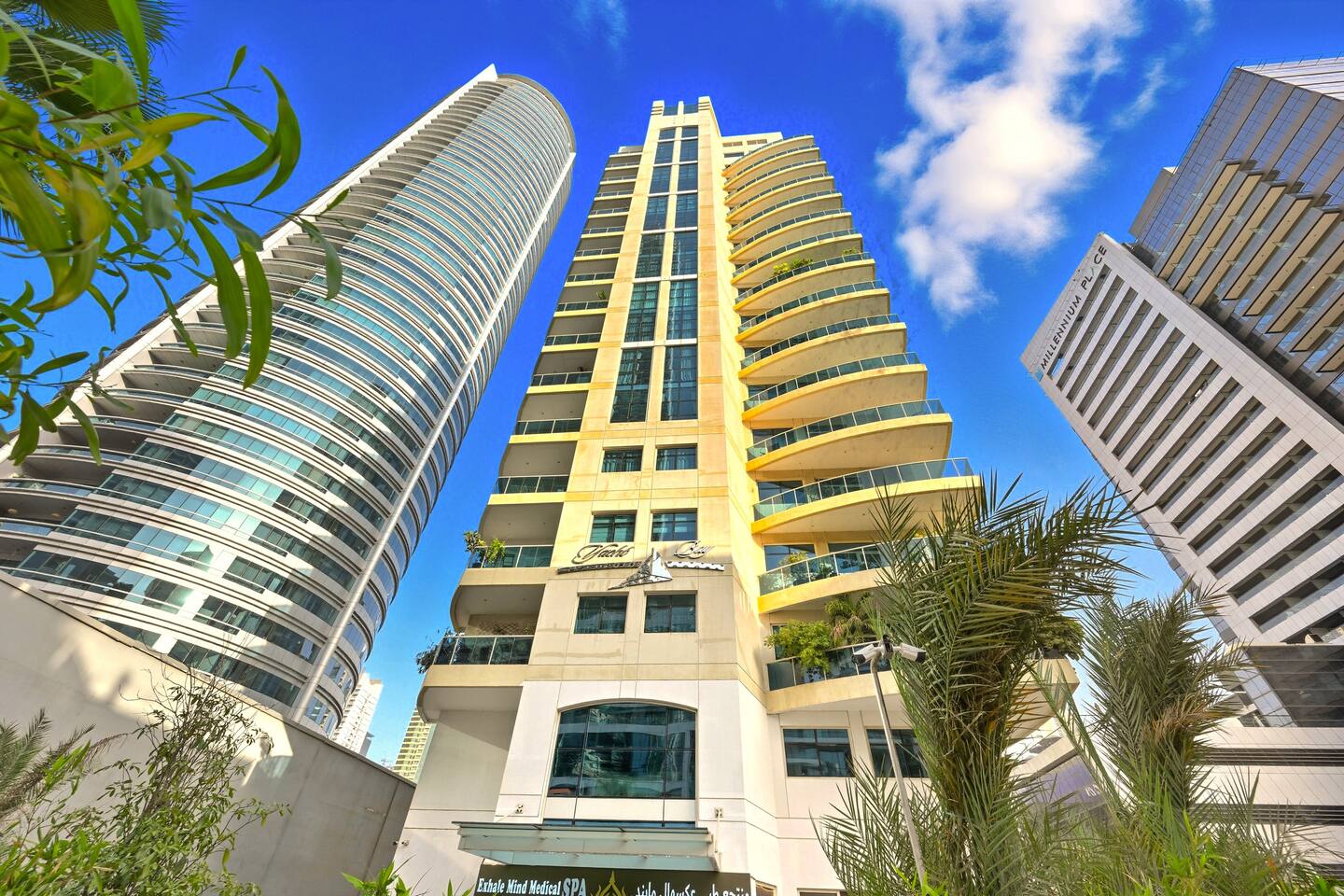 Dubai Marina is one of the most iconic and prestigious waterfront districts in Dubai, known for its luxury skyline, lively atmosphere, and world-class urban design. Yacht Bay Tower is positioned in one of the most strategic and quiet sections of the Marina, offering immediate access to the waterfront while maintaining a refined residential environment. The neighborhood is built around a 3.5-km promenade lined with cafés, restaurants, boutique shops, and recreational areas. Guests can enjoy morning walks along the Marina Walk, dine at some of Dubai’s most renowned international cuisines, or explore the nearby Marina Mall for shopping and entertainment. Just steps from Yacht Bay Tower stands the Dubai Marina Metro and Tram Station, allowing fast and seamless connections to JBR, Palm Jumeirah, Mall of the Emirates, and Downtown Dubai. Supermarkets, pharmacies, gyms, salons, and water-sport facilities are all within minutes on foot. Safe, elegant, and vibrant, the area combines beachfront living with urban comfort, making it one of Dubai’s most desirable residential hubs for families, tourists, and business travelers alike.
